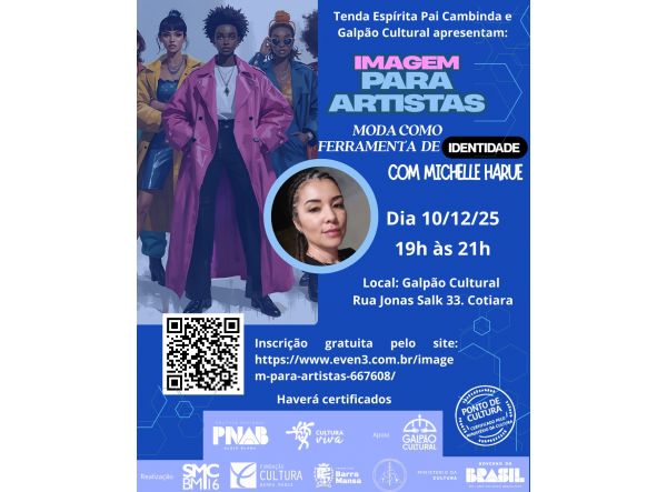 A construção da imagem é uma das ferramentas mais poderosas para qualquer artista — seja no palco, nas redes sociais ou na vida profissional. Pensando nisso, o **Galpão Cultural** recebe no dia **10 de dezembro** a oficina **“Imagem para Artistas – Moda como ferramenta de identidade”**, ministrada por **Michelle Harue**, especialista em estilo, expressão visual e branding pessoal.